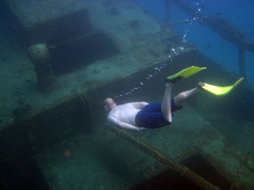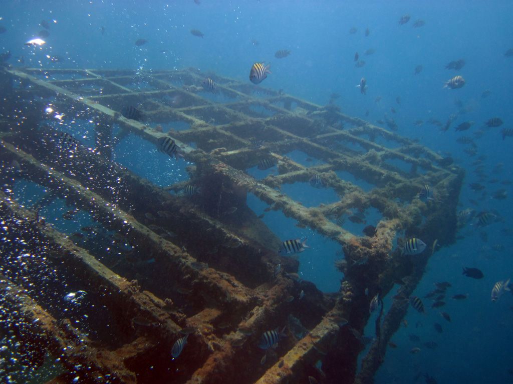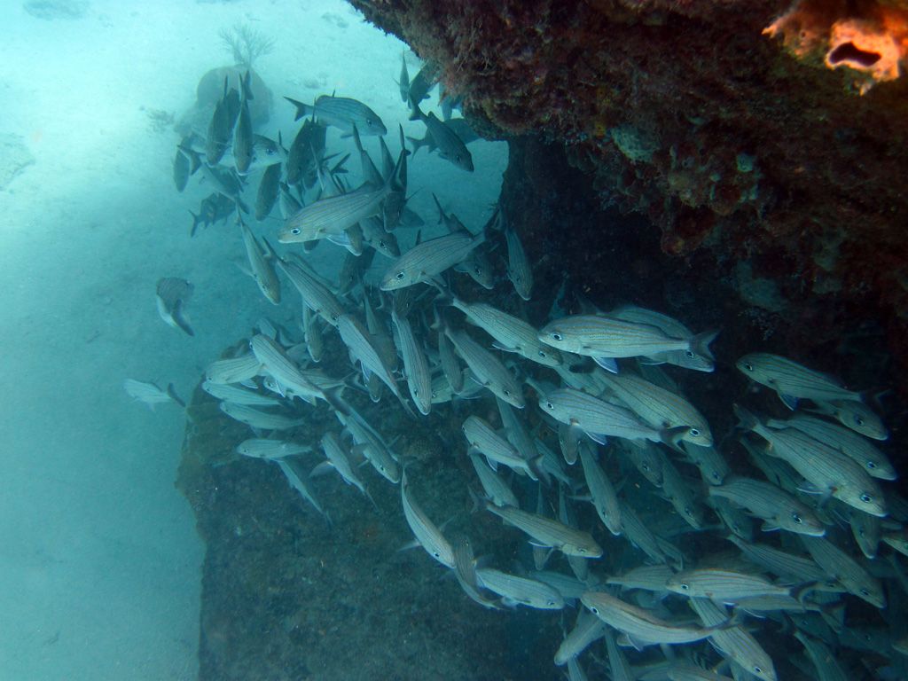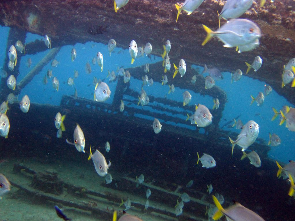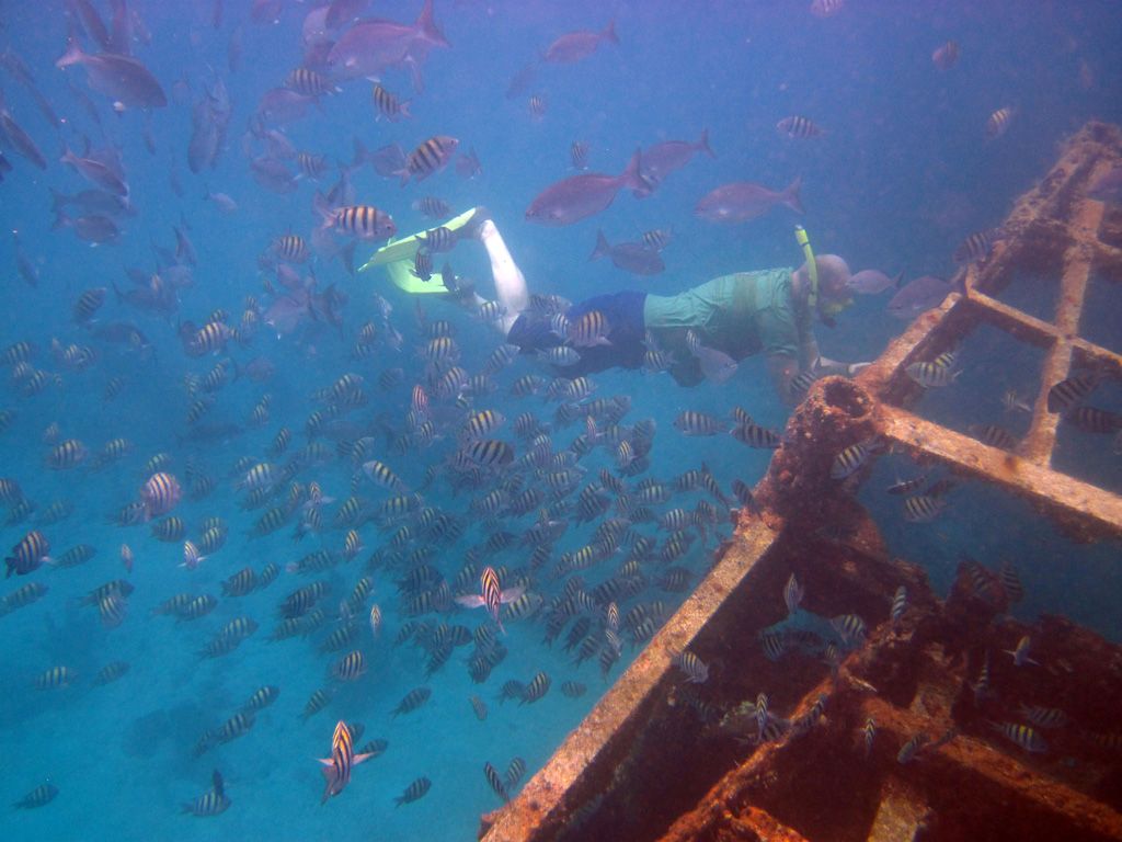 They sit in 30ft of water and are teeming with fish – the catamarans and glass-bottom-boats feeds this fish daily so they are very confident. I would recommend taking a bag of bread out with you to experience it. The wrecks are quite plain – just simple barges but you will also find eels around them if you search.