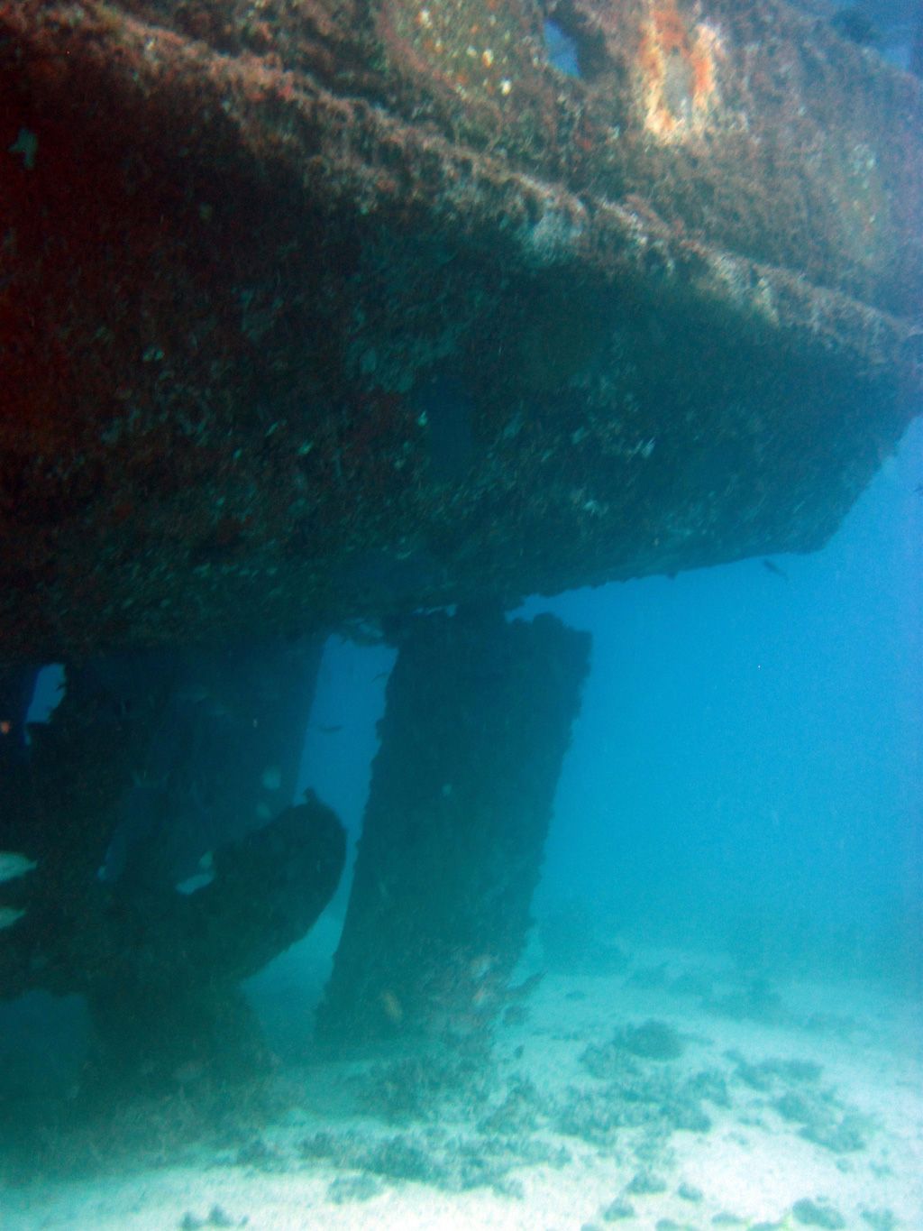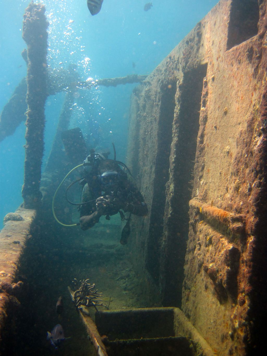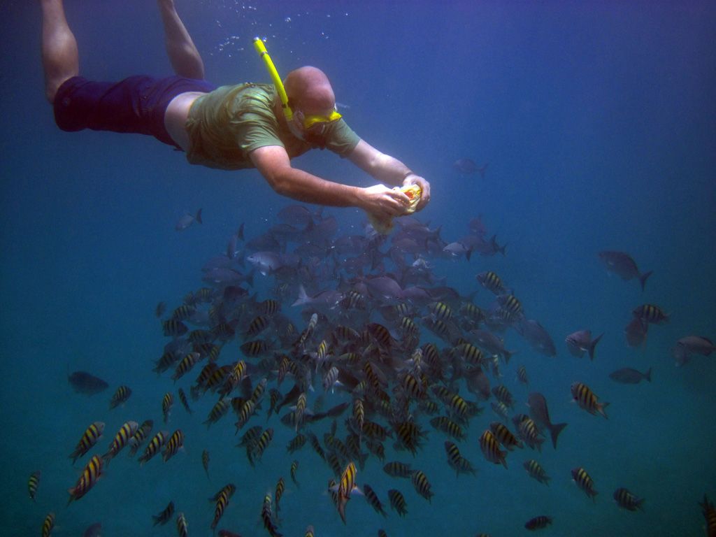 They sit in 30ft of water and are teeming with fish – the catamarans and glass-bottom-boats feeds this fish daily so they are very confident. I would recommend taking a bag of bread out with you to experience it. The wrecks are quite plain – just simple barges but you will also find eels around them if you search.