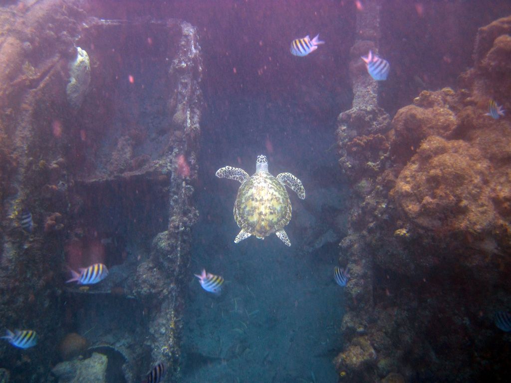 You can get in the water here and swim straight out through the reef. The reef, while teeming with fish life isn’t in fantastic shape here but there is a lot to see. If you venture a little further out (look for the floating buoys in the water) there are two small ‘wrecks’ to see.