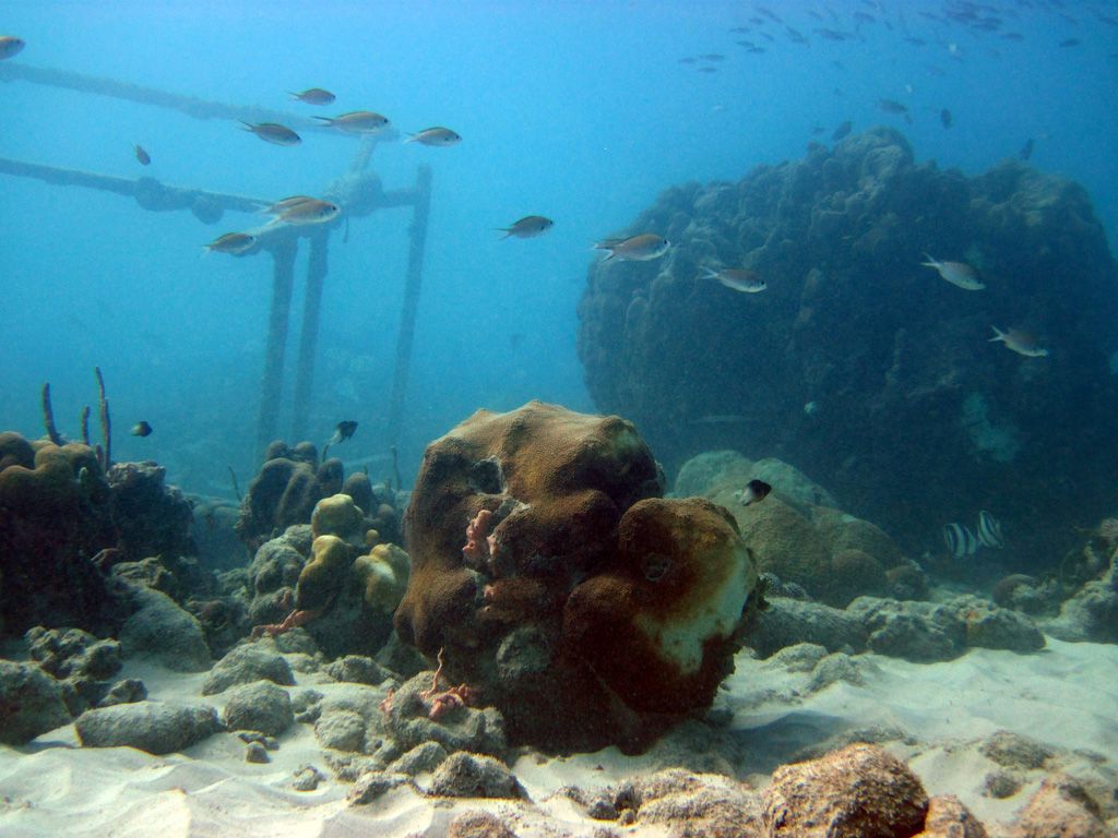 Coming in closer to shore and at the tip of the boardwalk is sand dollar alley – diving down (20ft or so deep here) you’ll find hundreds of sand dollars and the occasional heart urchin as a souvenir.