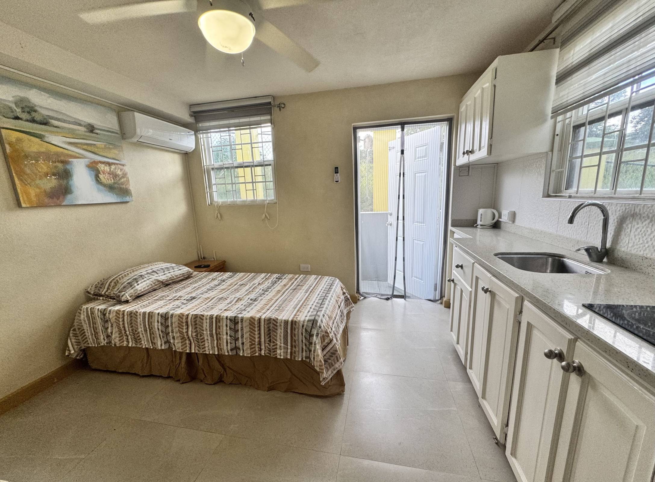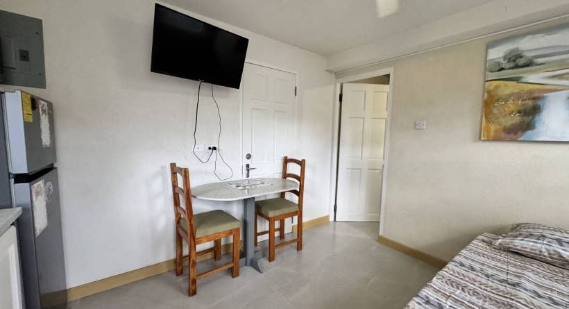Boarded Hall has become a fast growing residential area with the newly constructed Estates project. This self-contained, downstairs air-conditioned studio unit, is cozy and well maintained. The space has a single bed, 2 seater dining set, kitchenette area with built in cupboard space, two burner electric countertop stove, refrigerator and microwave. The bathroom is separate and there is also a small closet space for storage. The unit is air-conditioned and there is a wall mounted television, it is part of a 3 unit property, with a tenanted main house and a tenanted second studio apartment. The washing area is shared with the other studio and it is equipped with a washing machine, there are drying lines.