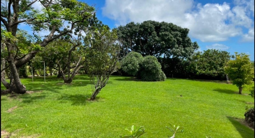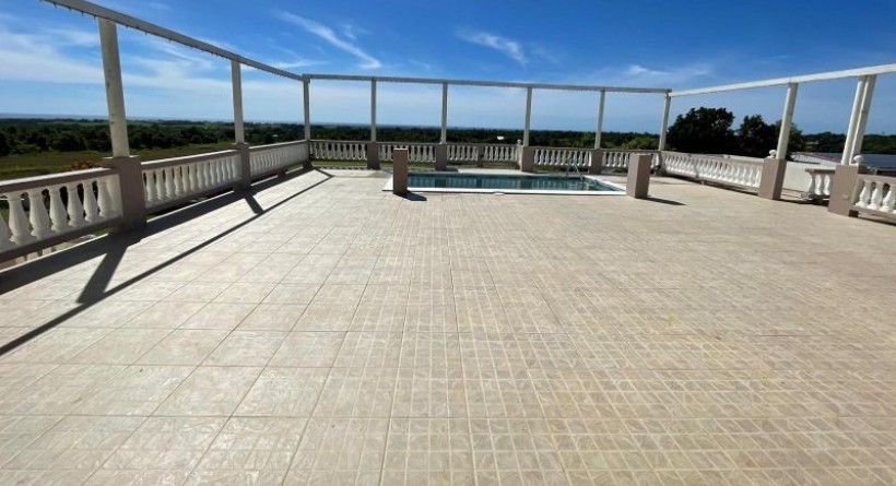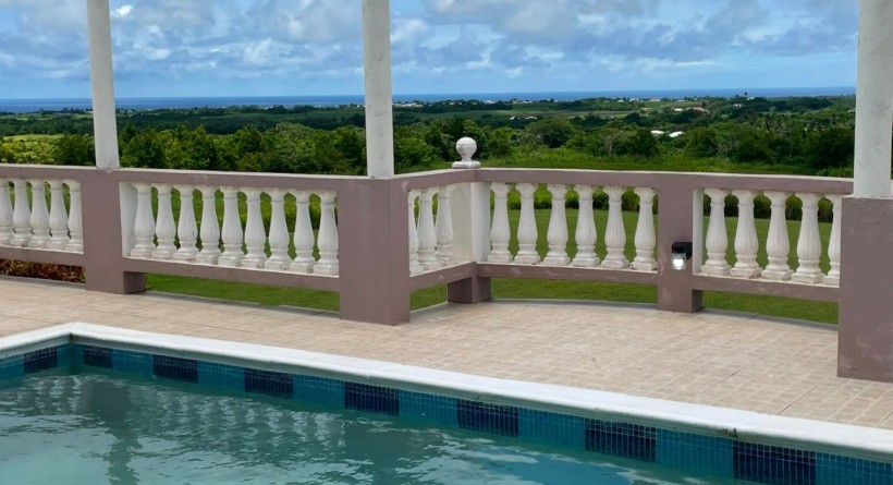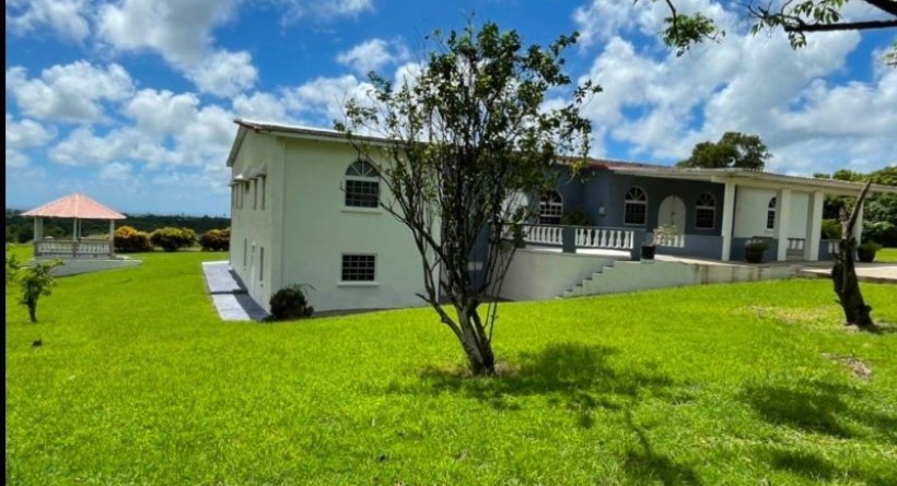 Nestled within the serene landscapes of Belle Farm, St. George, this split-level property spans 2.7 acres of lush, manicured grounds, currently serving as a premier event venue and tranquil retreat. The property makes a striking first impression with a welcoming covered front patio that transitions seamlessly into the expansive, open-plan living and dining areas, designed to capture natural light and cool breezes. At the heart of the home’s entertainment wing is a vast deck featuring a fully equipped wet bar and a sparkling swimming pool, all positioned to frame breathtaking views of the rolling countryside that stretch toward the distant ocean horizon.