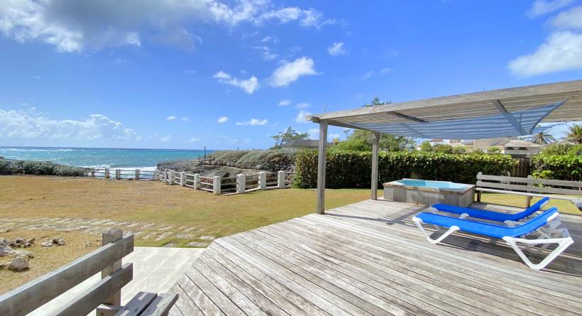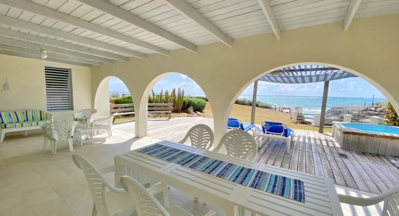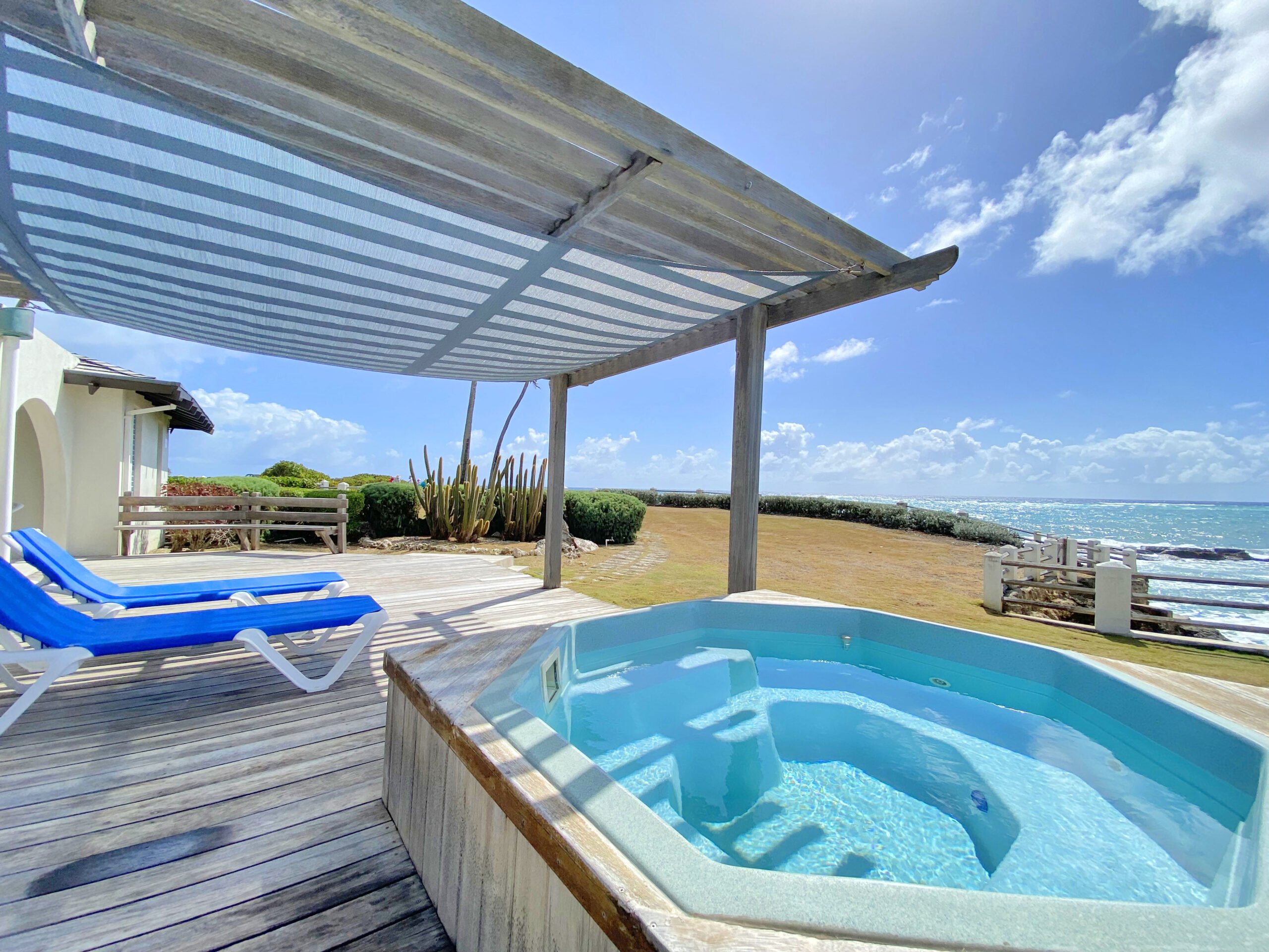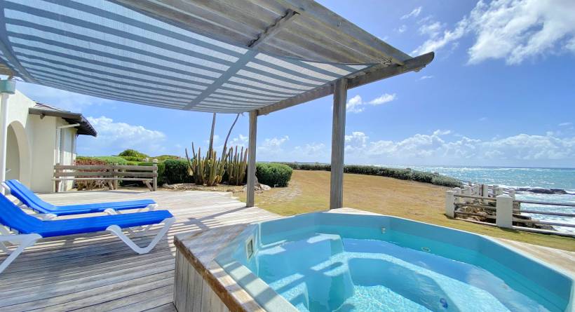 Through the main entrance is an open plan layout of the dining and living area with high ceilings. Extending out onto a spacious patio, overlooking the ocean perfect for lounging and alfresco dining. There is a Jacuzzi, but the space offers ample room for the addition of a larger pool if needed and is mere steps from the most intimate bay.