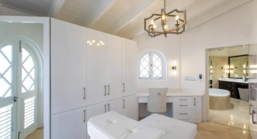 Upstairs, five spacious bedroom suites offer exceptional comfort and privacy. Each is en-suite, and several open onto private balconies that frame elevated coastal vistas and welcome cooling trade winds. A custom-designed office provides a polished and peaceful workspace, ideal for extended stays or remote working.