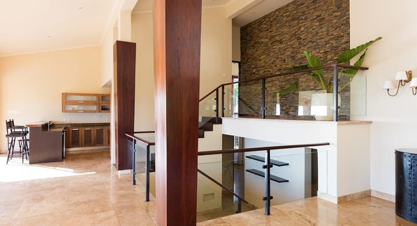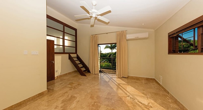 Master Bedroom with double vanity ensuite bathroom with large stall shower, 2-person tub and built in closets. The master suite also features an elevated loft type home office. A Romeo & Juliet balcony overlooks the pool and back garden from the master suite. The landing overlooking the living area connects the master suite with another bedroom.