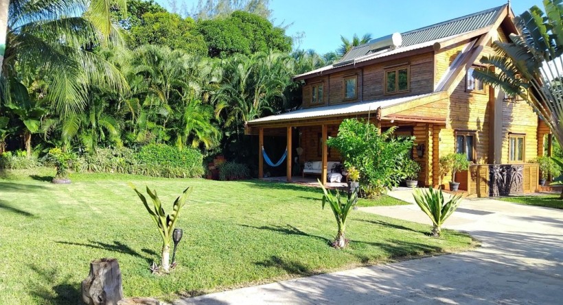- Open-plan kitchen, dining, and lounge opening onto a shaded deck and tropical garden