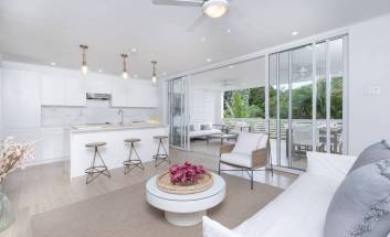 Inside, the open-plan layout features a modern kitchen with natural stone countertops, a bright living area with designer furnishings, and floor-to-ceiling bi-fold doors that lead out to a private balcony. The bedrooms are spacious and elegantly finished, with built-in wardrobes and a sleek, contemporary bathroom.