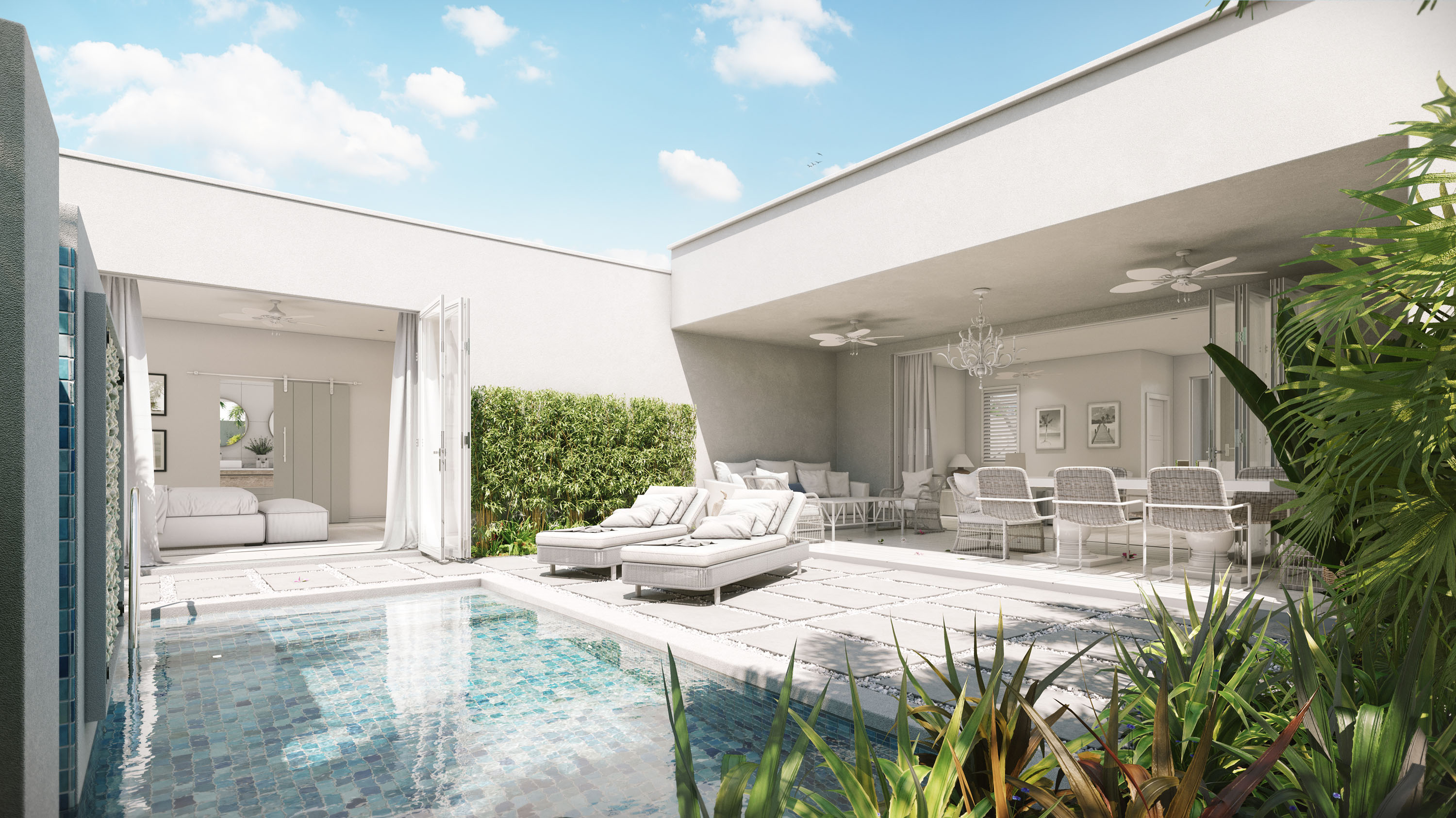 Fully detached, freehold luxury villas, architecturally designed to facilitate seamless flow between indoor and outdoor living. Each luxury villa is positioned on a plot of approximately 5,000 square feet offering either 3 or 4 generous double bedrooms and 3 or 4 bathrooms respectively. The 3 bedroom villas are arranged over 1,800 square feet of covered area while the 4 bedroom option extends to 2,195 square feet of covered space with dedicated exterior patio space of approximately 1,000 square feet for either configuration. Entertaining will flow seamlessly from within the villa to the covered dining area and onto the deck surrounding either the 14′ or 20′ pool.