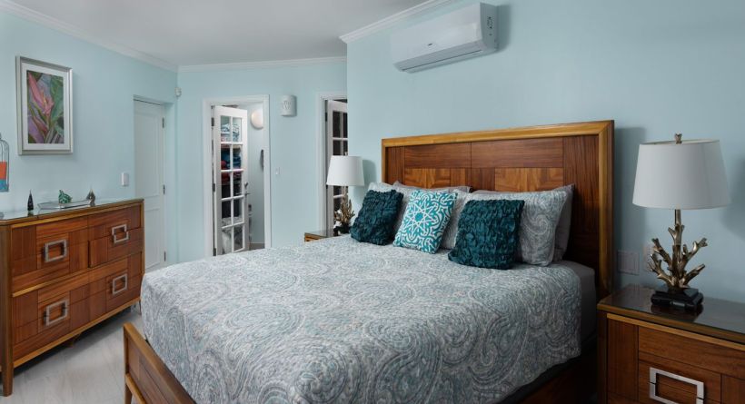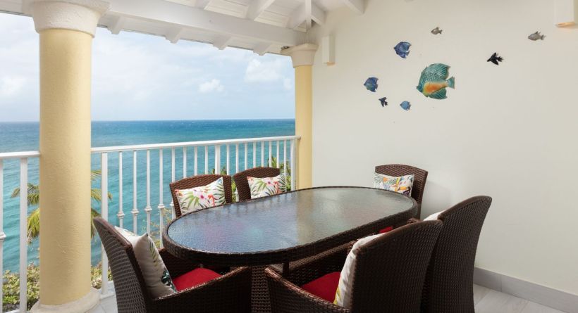 Expansive glass doors lead out to a generous covered balcony, perfect for al fresco dining or relaxing with the sound of the waves as your backdrop. The primary suite is a serene retreat featuring a king-sized bed, "his and hers" closets, and a spacious en-suite bathroom with a double vanity. Positioned to make the most of the panoramic ocean views, this suite allows you to wake up to the beauty of Barbados each morning.