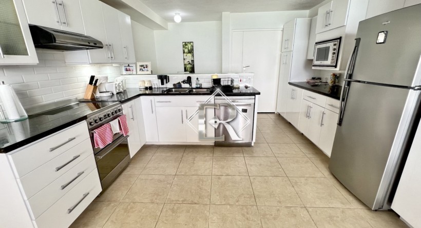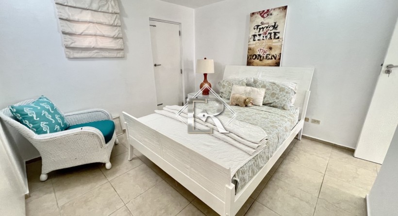 Arranged over two levels, the property is tastefully furnished with a bright, tropical open-plan living and dining area that flows into a fully equipped kitchen with stainless steel appliances and ample storage. The air-conditioned living room ensures comfort, while a washer and dryer add convenience. Doors open onto a private patio overlooking the communal pool and the Caribbean Sea, ideal for morning coffee or evening relaxation.