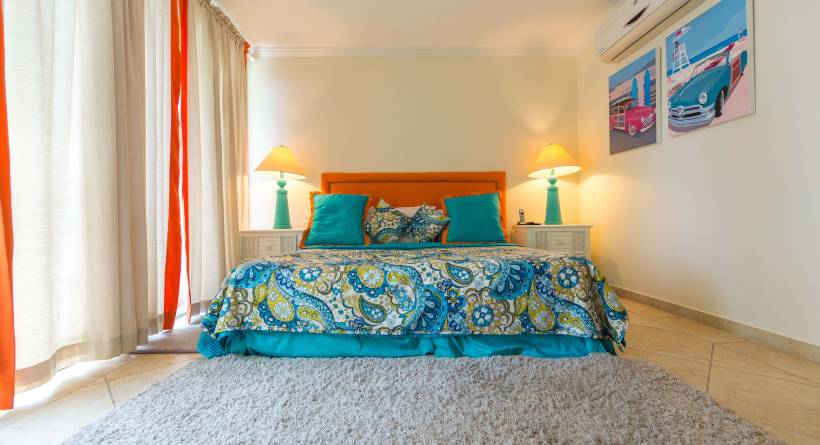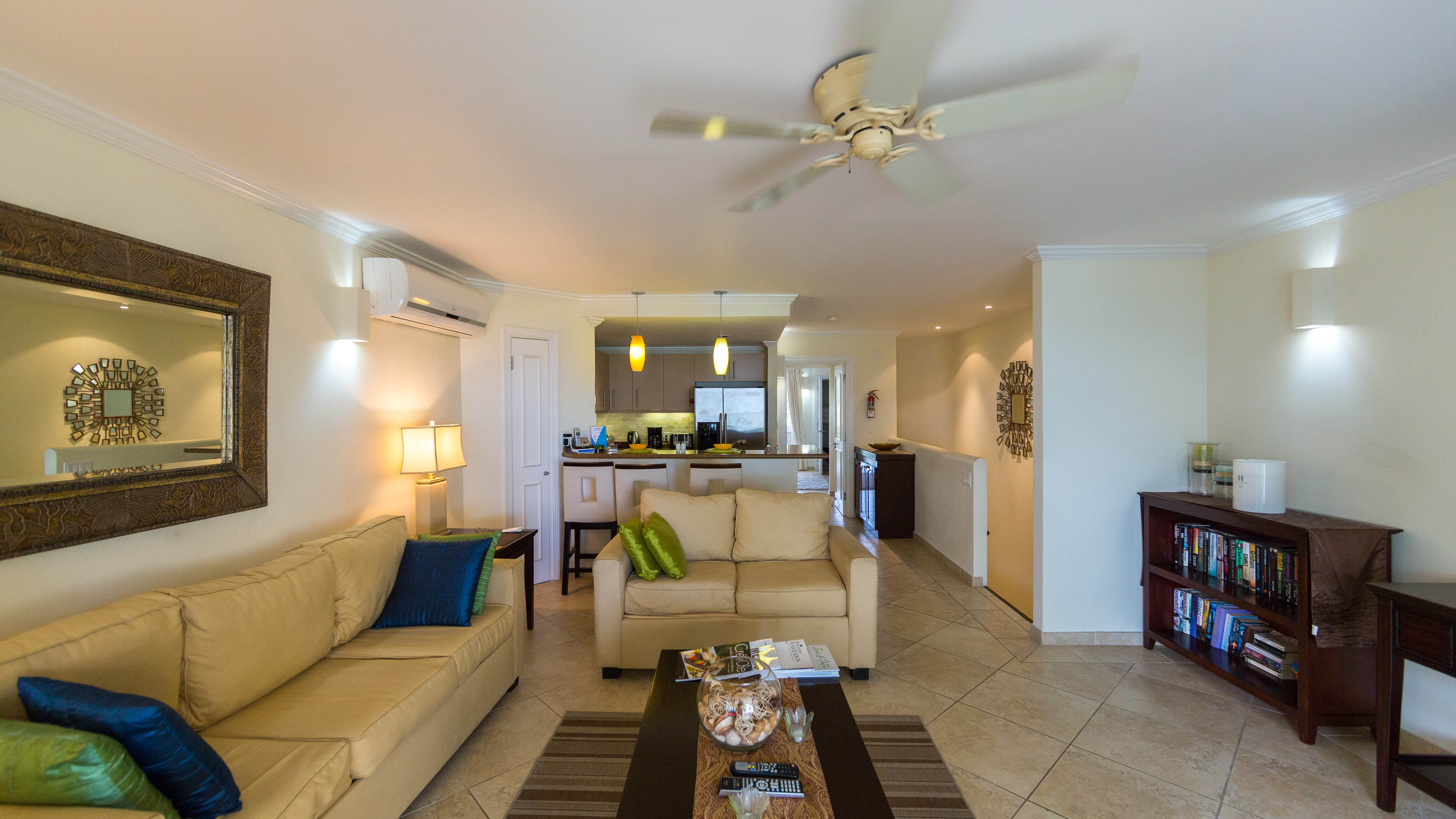 The two bedroom apartments at Sapphire Beach are almost 1630 sq.ft of beachfront luxury are quite unique featuring a split level design on the ground and first floors of the building. The entrance and the master bedroom are on the ground level of the apartment, with the latter having direct access to the pool deck and gardens. On the upper level is the living room (Queen sized sofa bed), kitchen, second bedroom and balcony, offering excellent views overlooking the pool to the beach and ocean beyond.