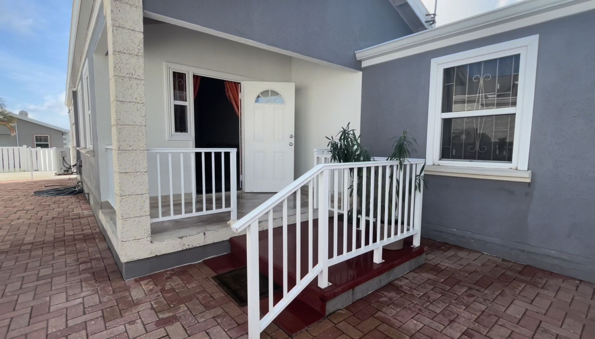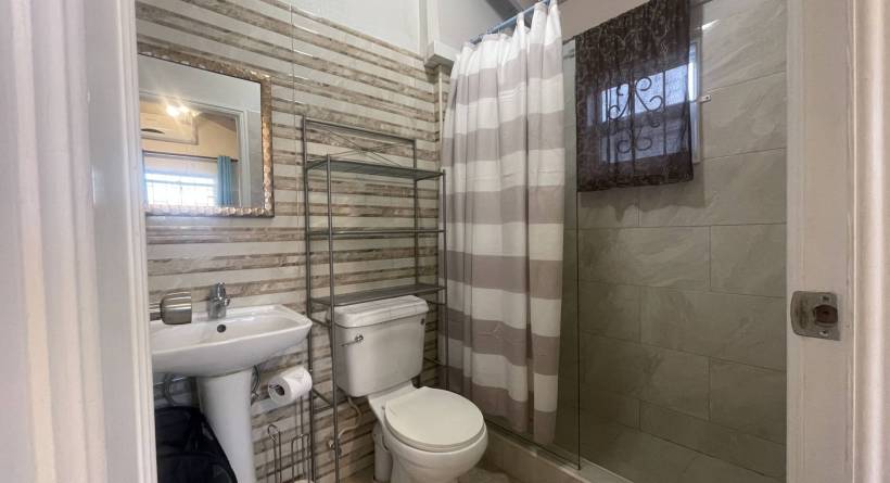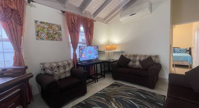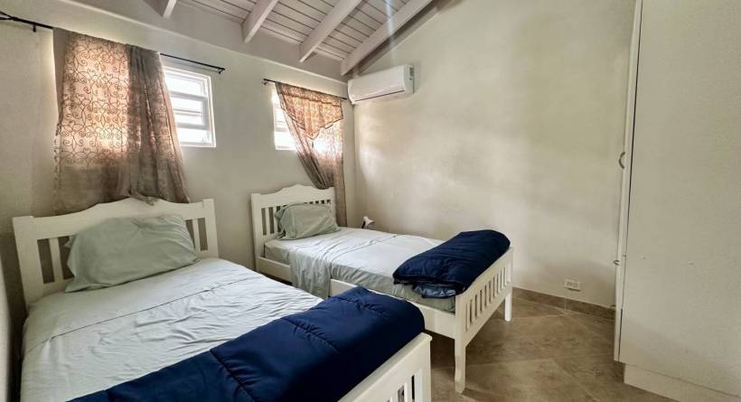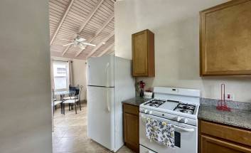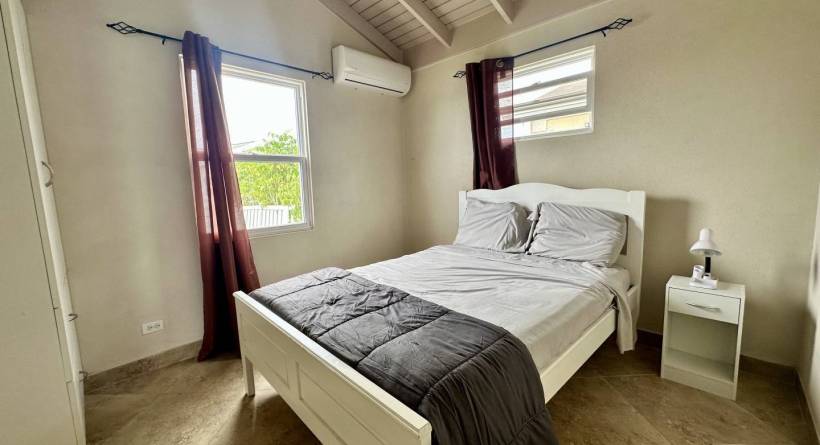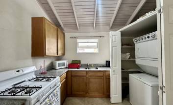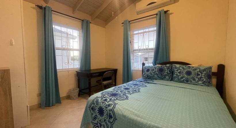 This fully air-conditioned home offers at entry a small patio which leads into an open-plan living and dining area. The home is outfitted with security grills and insect screens throughout. The kitchen is fully equipped and features a pantry and laundry area with a washing machine, dryer, and utility sink. Just off of the kitchen is a garage. Bedrooms 1 and 2 share a bathroom and are outfitted with full-sized beds, closets and desks. The primary bedroom is also outfitted with a full bed, closets and a desk has an en-suite bathroom.