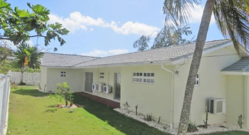 Executive style semi-furnished 4 bedroom, 5.5 bathroom villa in the well established Durants neighborhood. Automatic gates allow entry to the covered garage. There is an entrance via the living room and one via the kitchen. The living room is large with a bar at one end, and opens onto a covered patio with a pool. The dining area is off of the living room, and leads into the sizable air conditioned kitchen. Currently the kitchen has a dish washer and an electric stove, and a fridge can be installed as well. The four ensuite bedrooms are on the left side of the home, and all have AC units, ceiling fans and generous closet space. On the lower level is the laundry area, which can be furnished with a washer and dryer. There is a spacious room on this level, which can be a den or playroom. At the rear is a bathroom and bedroom which can be used as staff quarters. Pool and garden maintenance are included in the rent, all other utilities are at the tenant.