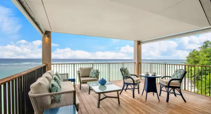 Apartment 201 offers the luxury of a private patio where you can enjoy the cool sea breezes. The expansive glass doors and spacious patio create a seamless indoor-outdoor living experience, perfect for dining, entertaining, or simply relaxing while taking in stunning sea views.
