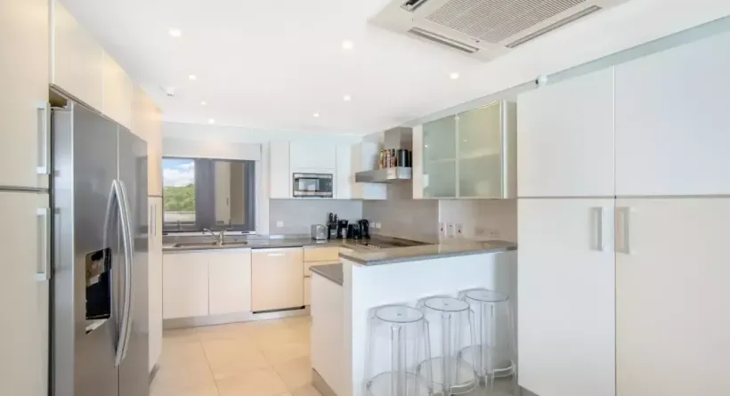 As you enter the property, your eyes will be immediately drawn to the large patio and the panoramic ocean views. The open-plan living and dining area provides ample space for hosting guests, and the fully equipped kitchen features high-quality Italian-made appliances, including a built-in oven, stove, microwave, and dishwasher.