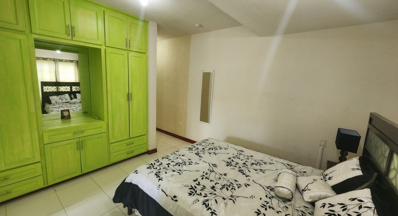 The bedroom is spacious, has ample closet storage with a dresser and a large bed suitable. A private bathroom is just around the corner. The bedroom is also air conditioned for comfort.