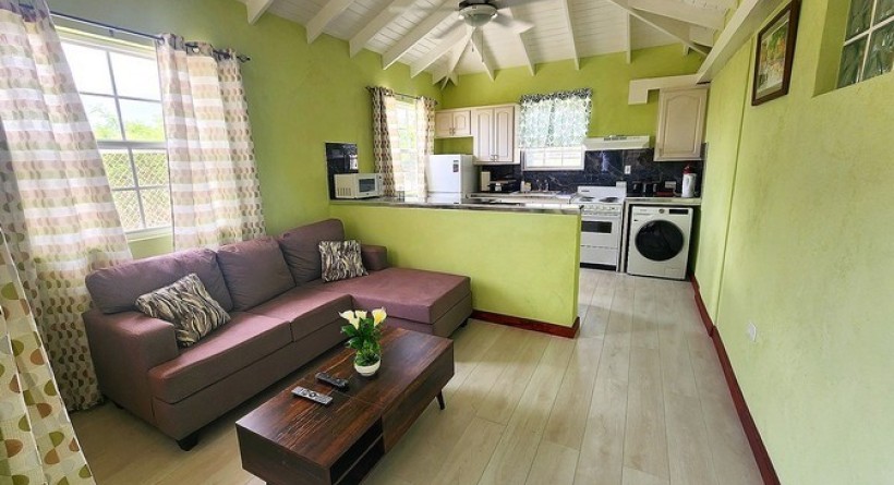 The living area is comfortably furnished with a sofa, center table and a mounted TV on the wall. The kitchen has major kitchen appliances plus a washing machine and a mini bar area for dining.