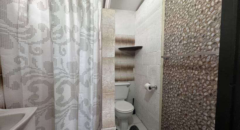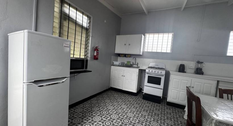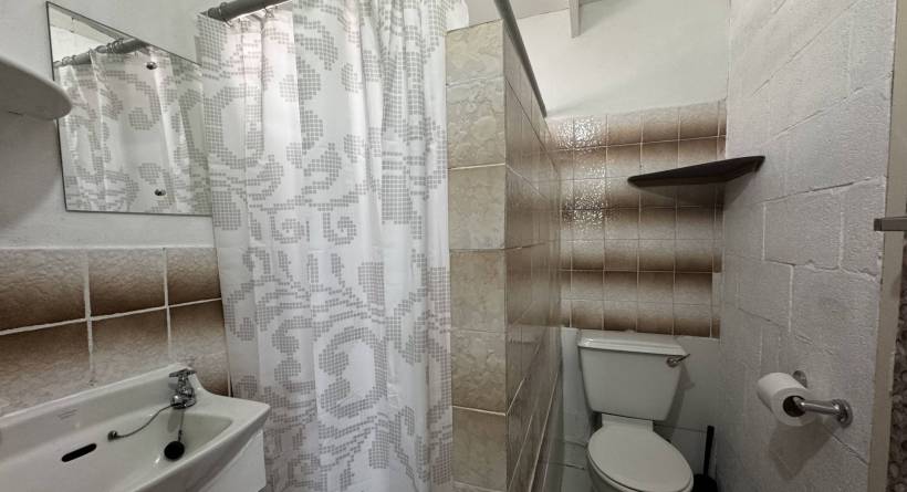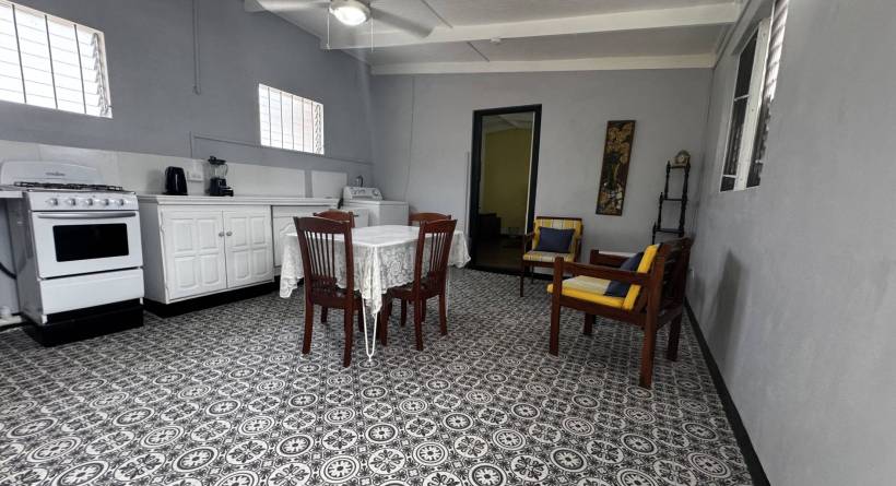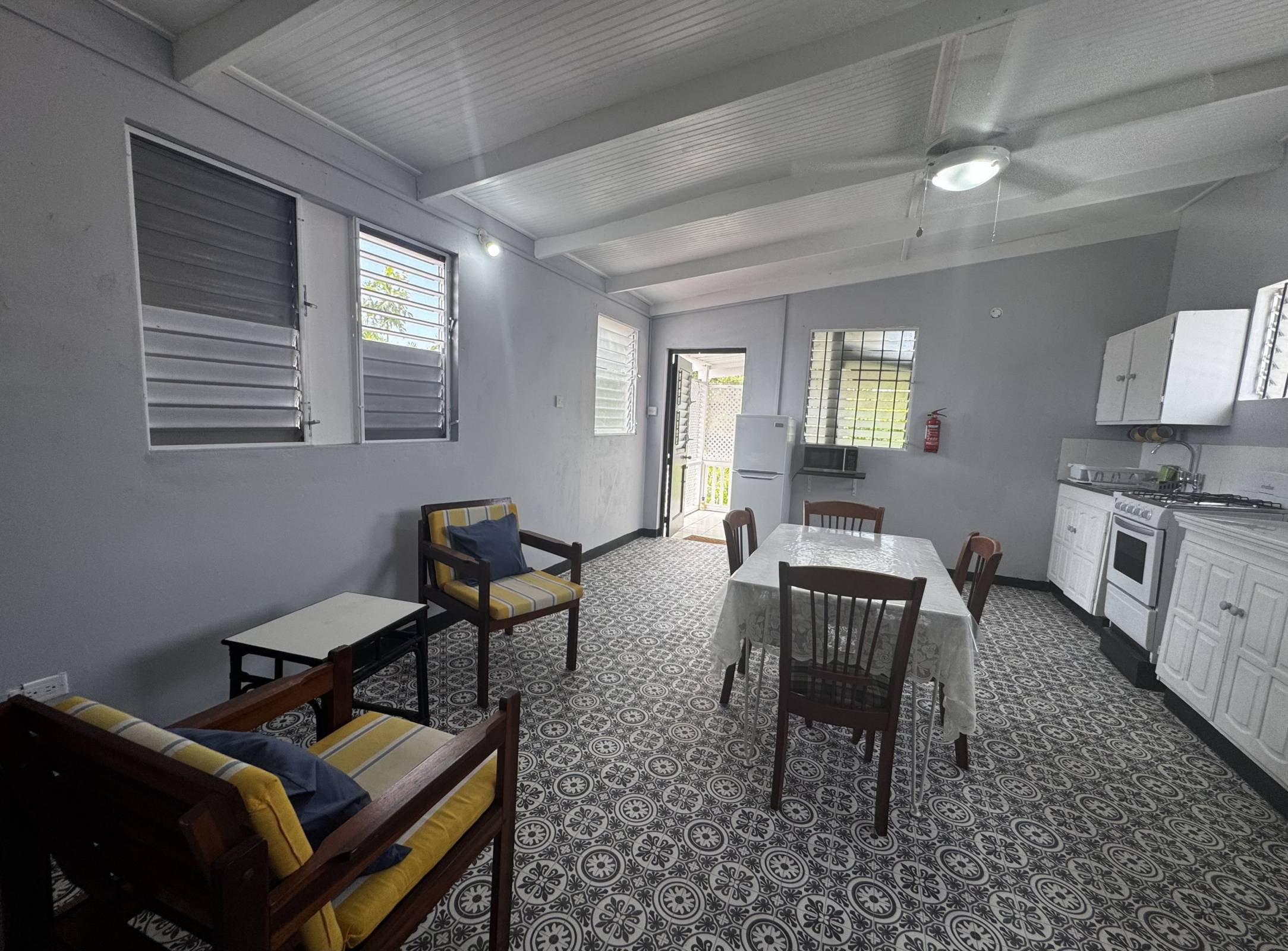 Wildey Terrace is a quiet residential area, just off our major highway, with easy access to amenites and services. This furnished, upstairs, open plan unit is cozy and outfitted with basis living and dining furnishings, the kitchen area has a 4 burner gas stove, 2 door refrigerator, some small appliances, pots and pans, glassware and kitchen utensils. There is also a laundry area with washing machine and sink. The single bedroom is furnished with a double bed, it has built-in closet space and an en-suite bathroom with a shower.