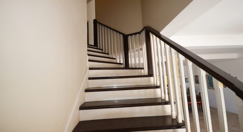 On the ground floor, the main entrance leads into a spacious foyer, dining room and separate formal living room. The well-appointed modern kitchen opens out onto a countertop with seating that’s perfect for breakfast for two. Also on the ground floor, there is one bedroom with its own kitchenette, bathroom and a large room currently being used as a gym.