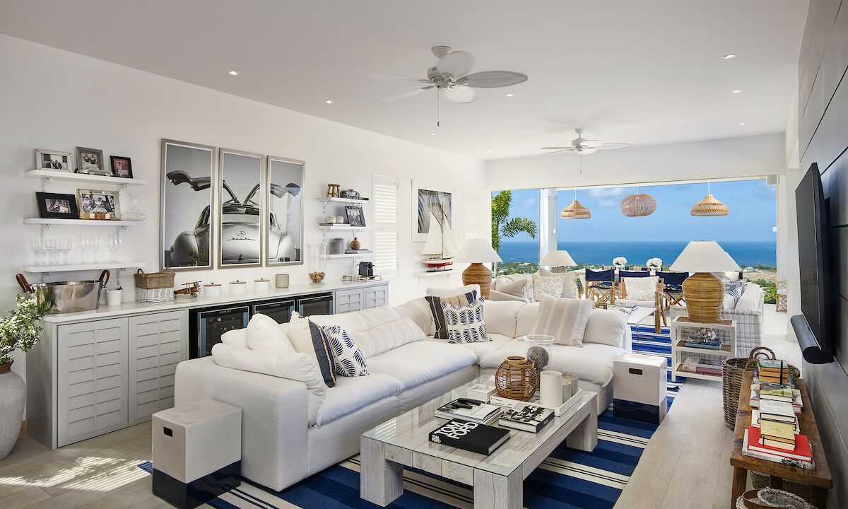 There is a bar in the kitchen with a cosy breakfast nook. The space is cooled by ceiling fans and takes advantage of the sea views.