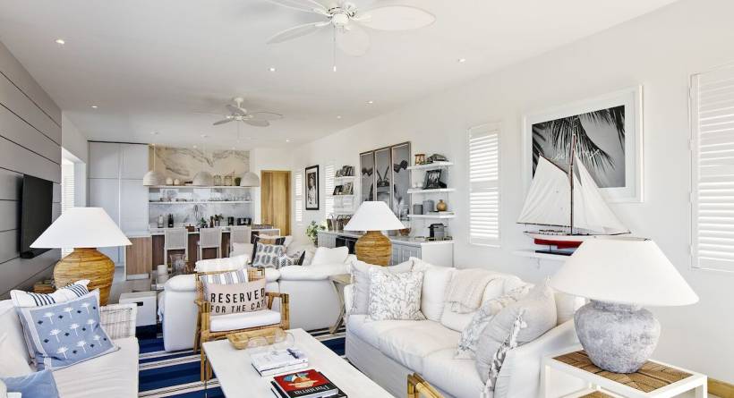 The living areas feature an open plan design. The property is decorated with lots of white, nautical blues and contemporary black-and-white photography.