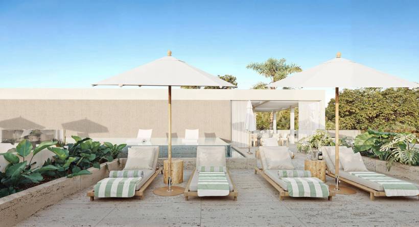 Private Sky Terrace rooftop level with a pool, bar, barbeque and dining lounge areas and stunning panoramic views of the sea.