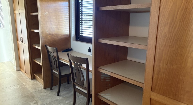 The upper level has 2 bedrooms that share a bathroom and a lovely primary en suite bedroom with a large walk-in closet. The primary bedroom also enjoys a private balcony overlooking the pool and garden. All of the bedrooms have air condition, ceiling fans and built in cupboards.