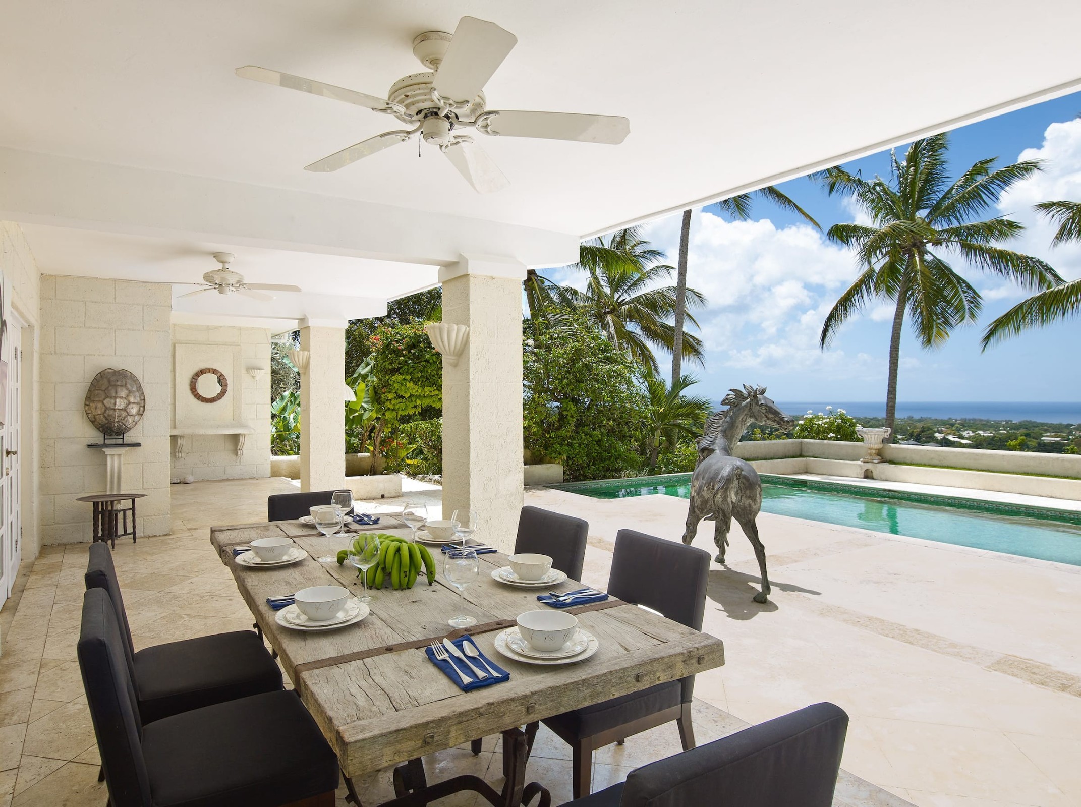 The entertainment area on the pool deck is expansive with its own BBQ house and spacious dining/lounging area all enjoying the spectacular Caribbean Sea views as a backdrop. Two ensuite bedrooms with a further bathroom for the third bedroom offer ample sleeping accommodation with a large walk-in closet in the master. Separate staff quarters and an office/storeroom adjacent to the kitchen make it convenient for live-in help. A large pantry and washroom lead from the kitchen to the garage.