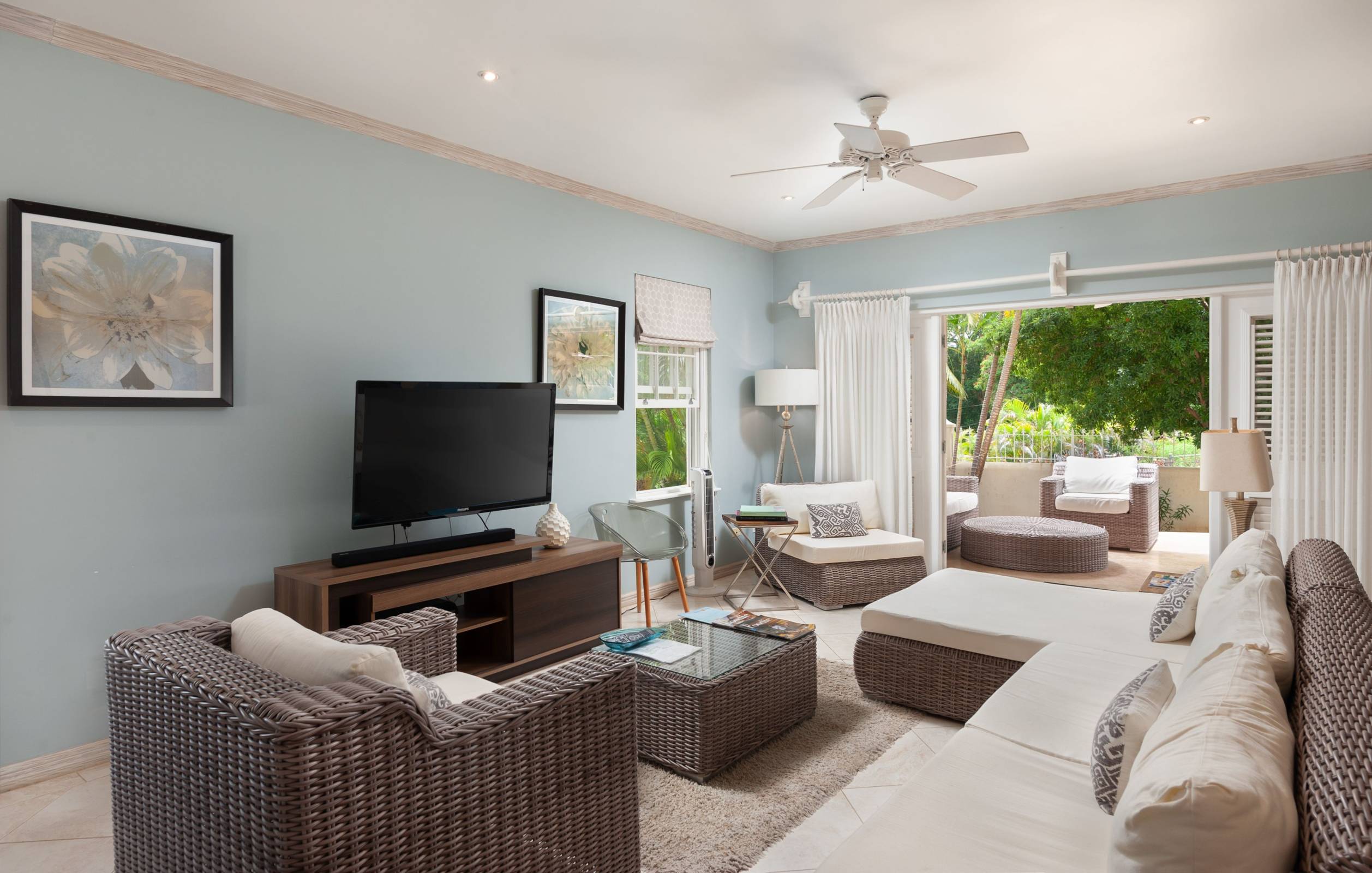 One Battaleys Mews is a 3 bedroom, 2 ½ bathroom villa in this well kept gated community. The two-storey home with private parking for 2 cars just by the entrance, leads you to the nicely furnished and inviting open concept living and dining room on the ground floor. The living/dining room affords a light comfortable ambience with its white and nude furnishings including a sectional sofa, coffee table, dark brown TV with accompanying flat screen TV and dining table with seating for up to 8 persons. Just past the double doors is the personal covered terrace with a plunge pool and garden area. Also situated on the ground floor is the equipped kitchen fitted with a stove top with hub, oven, microwave and other essential pieces. All bedrooms are situated on the first floor with the Master bedroom affording a private en suite bathroom with both a tub and shower plus a private balcony. The other two guest bedrooms share a bathroom with a walk-in shower.