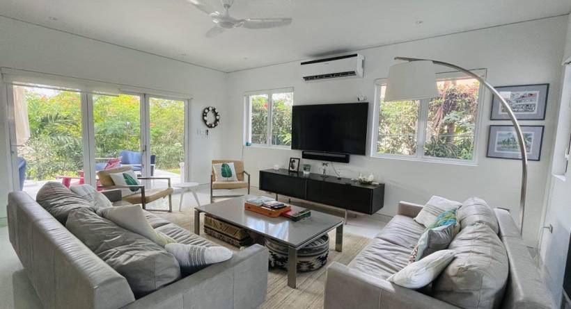 Features include solar panels for water, an electric gate and air conditioning in all bedrooms as well as the main level.