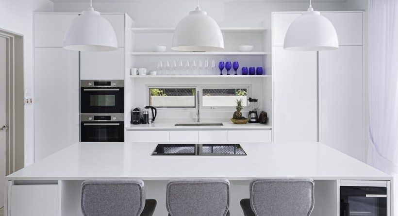 The open-plan interior is finished in a clean, contemporary palette with quartz countertops, premium appliances, and curated furnishings. Two of the three bedrooms feature en-suite bathrooms, while the third guest bedroom has access to a full bathroom directly adjacent. This has proven ideal for guests and also perfectly positioned to serve as a powder room when entertaining.