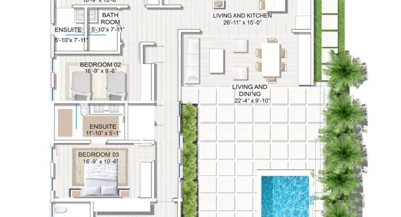Each luxury villa is positioned on a plot of up to 5,450 square feet, offering either 3 or 4 generous double bedrooms and 3 or 4 bathrooms respectively. The 3-bedroom villas are arranged over 1,800 square feet of covered area while the 4-bedroom option extends to 2,195 square feet of cove red space and dedicated exterior patio space of approximately 1,000 square feet for either configuration. Entertaining will flow seamlessly from within the villa to the covered dining area and on to the deck surrounding either the 14 or 20 pool