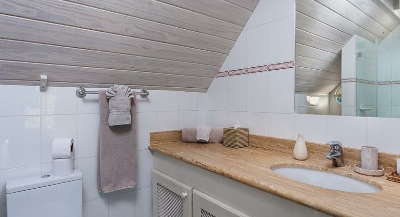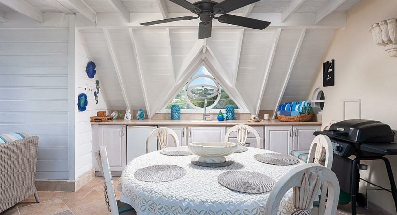 The penthouse features two inviting dining areas, one indoors and one on the coral stone terrace beneath a charming shaded pergola — perfect for alfresco meals with sea breezes and sunset views. The two spacious ensuite bedrooms are tastefully decorated with marble finishes and open directly to the outdoors, each equipped with ceiling fans and air-conditioning for year-round comfort.