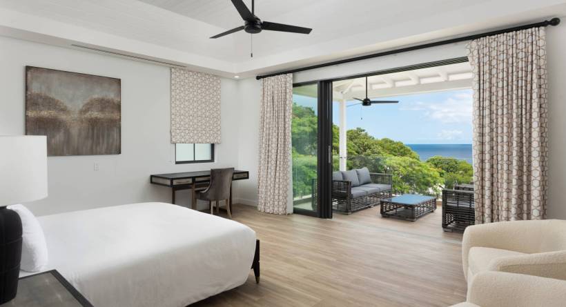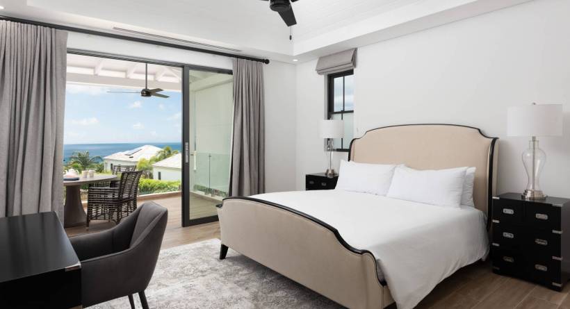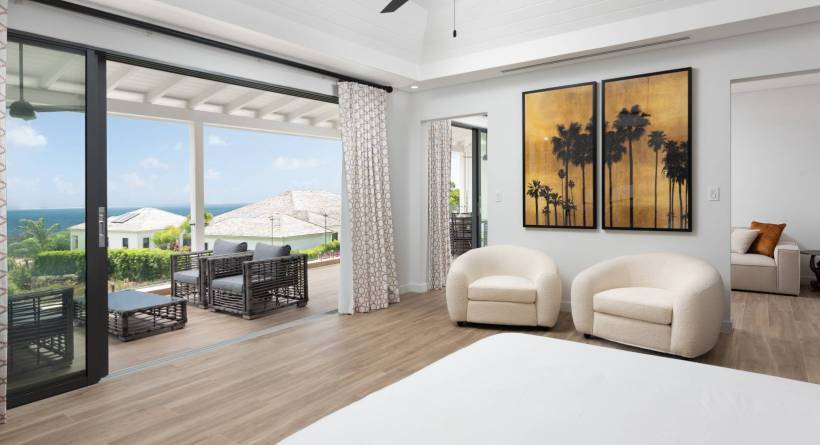 Upstairs becomes a private sanctuary as it is dedicated to ultimate relaxation and privacy. The main primary suite spans an impressive 15’ x 19’ with its own TV lounge area and en-suite bathroom complete with a freestanding soaking tub and dual vanities. There are two sets of sliding glass doors from both the bedroom and TV lounge opening to the large covered terrace and magnificent views. The guest suite on this level is equally generous, featuring its own sliding doors that open onto the terrace, offering stunning sea views, and a spacious bathroom. Together, these two suites share access to a remarkable 16’ x 35’ balcony—the perfect place to wake up with the Caribbean Sea as your backdrop.