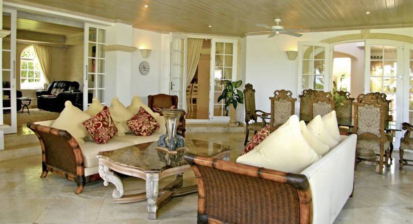Verbeia is a beautiful home nestled in mature landscaped gardens overlooking the 16th fairway.Centrally located on the resort on Coronation Drive, there is easy access to the Clubhouse andSanctuary swimming pool and gym.This lovely five-bedroom property is designed over two stories. The entrance welcomes guests throughthe courtyard and pool area into the foyer. To the right of the courtyard are two ensuite bedrooms. Thecomfortable living room with French doors opens onto the covered terrace around the pool and coveredoutdoor grill with an informal dining table. Lush gardens lead to a seated area overlooking the 16thfairway. A pathway from the covered terrace leads into the elegant dining gazebo.To the right of the foyer in a central position, is the large well-equipped kitchen. The relaxed media room isadjacent to the kitchen. The staircase leads to a stylish mezzanine floor, which features a study, two guestbedrooms and master bedroom.The master bedroom and one guest bedroom lead onto a large balcony with lovely views of the fairwayand Caribbean Sea. The master bedroom has been extended to include a large dressing room/loungearea. The abundance of relaxation and dining areas makes this spacious home ideal for entertaining.