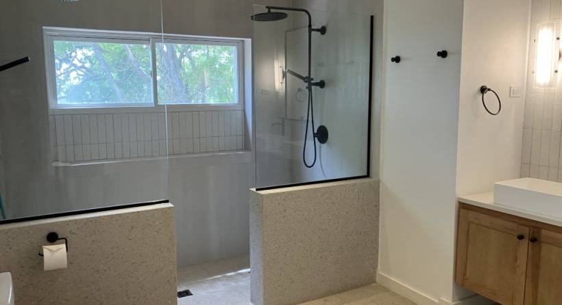 On the main level, the home boasts a contemporary gallery kitchen with an expansive island, adjoining the indoor dining space. This all opens onto the stunning central courtyard, featuring a landscaped, salt water pool and deck for sun-soaked relaxation or alfresco dining on the large covered terrace framed by looming mahogany trees providing the ideal space for entertaining. Situated on an elevated lot, you can enjoy the distant sea views and stunning sunsets. On this level there is also the separate TV room, powder room and large utility room with the washer and dryer and access to a drying yard.