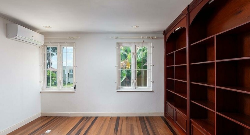 The villa boasts a modern kitchen and a two-room ensuite guest accommodation, as well as a TV room and a cozy study/library. For convenience, a laundry room and service quarters connect to a gym, while a double-car garage with an electronic door completes the ground floor amenities.