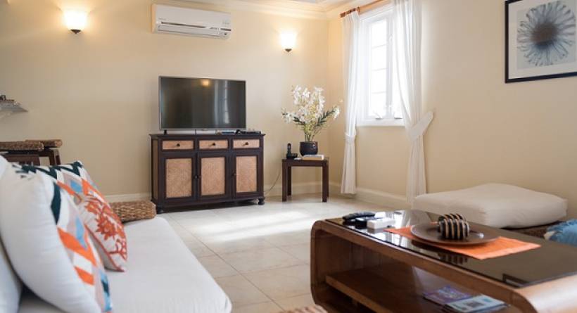The condo features a large terrace with ceiling fan, fully air conditioned living & dining, bedrooms and a beautiful view of the Caribbean Sea.