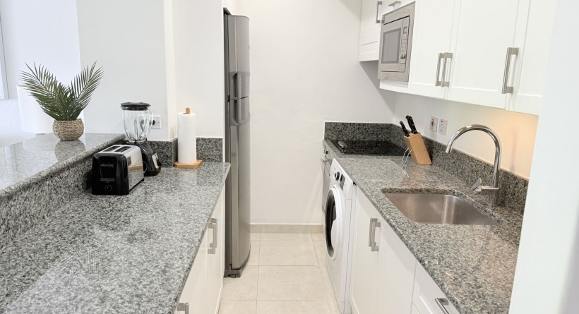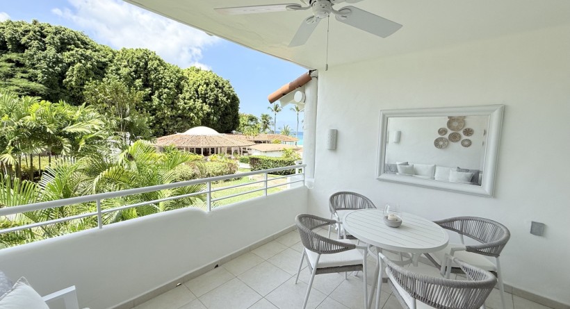 Glitter Bay 205 is a one bedroom apartment located on the second floor in the second block of the property offering pool and garden views and an ocean view from the balcony and sleeps 2 with the existing bedding.