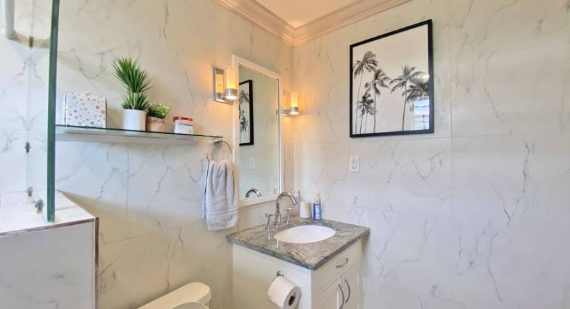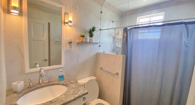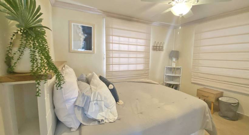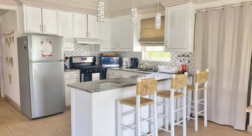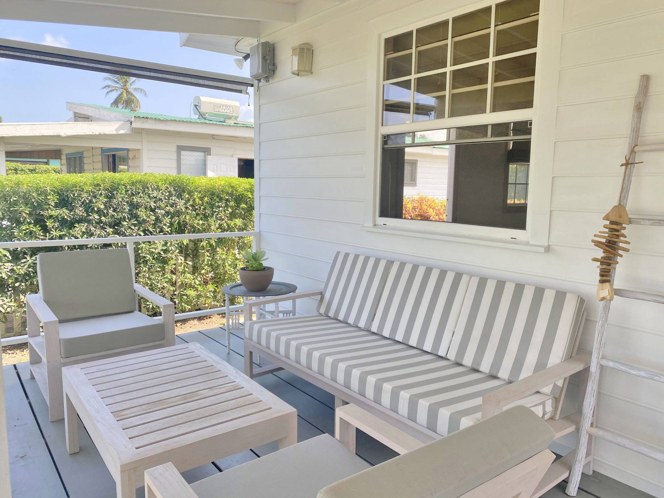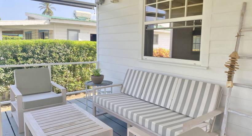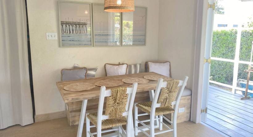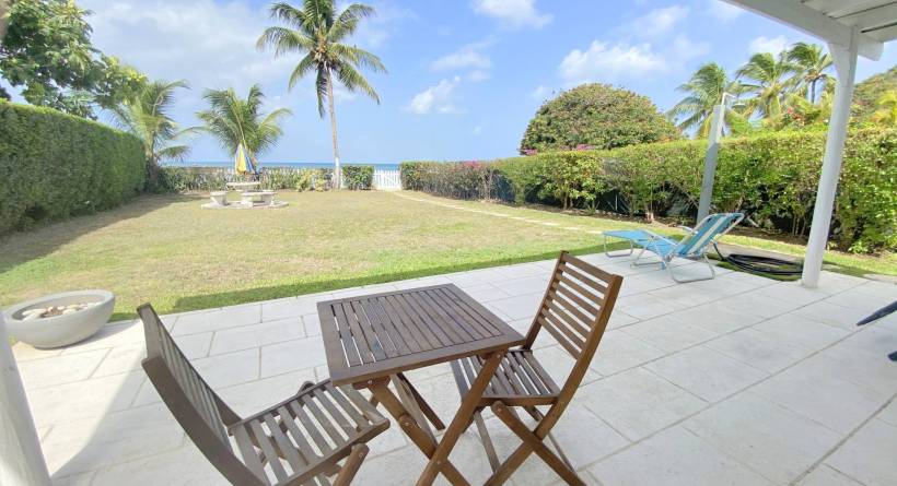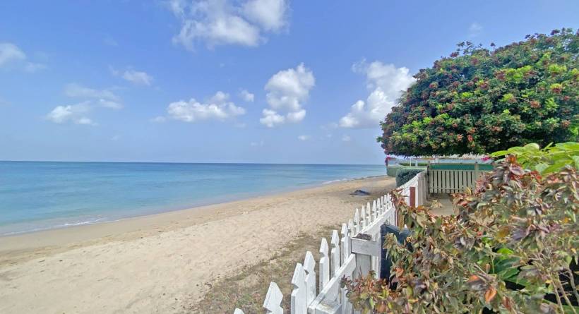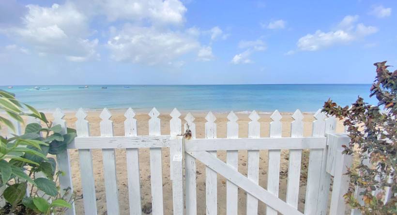 This tastefully designed, two-bedroom, two bathroom beachfront property is perfectly suited for visitors and locals alike. The open plan living space features a well laid out kitchen, complete with bar stools and a Tulum-inspired breakfast nook, which looks onto a large covered patio. The master bedroom is ensuite, while the second bathroom is accessible from both the living area and from inside the second bedroom via a solid sliding door. This allows for the second bedroom to also be ensuite without sacrificing privacy. Both bedrooms are outfitted with AC and there is a laundry room complete with washer and dryer right off of the kitchen. The lawn space which extends off of the covered deck offers plenty of room for lounging or exercise and the calm sea is perfect for paddle boarding or swimming. The immaculate beach views, together with the bohemian-style décor and modern furnishings all help to make this the perfect location for your next getaway in "paradise".